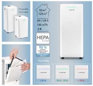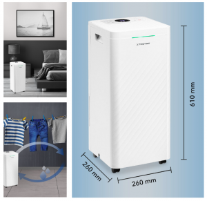 Máy bị hút ẩm và lọc không khí TTK64 HEPA với công suất hút mạnh mẽ tối đa 24l/ngày phù hợp việc giữ độ ẩm cho không gian nhà hoặc văn phòng với diện tích 50 m2. Thiết bị có đèn LED hiển thị trạng thái độ ẩm trong không gian