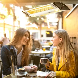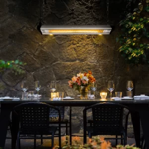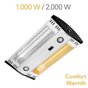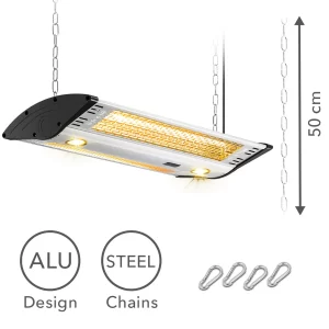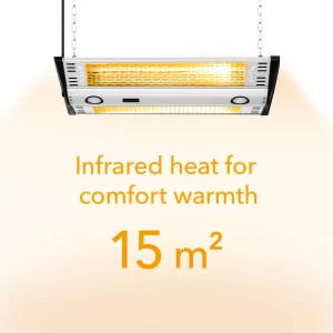Với bộ ba thiết kế tuyệt vời, khả năng chống chịu thời tiết và công suất tỏa nhiệt mạnh, máy sưởi bức xạ gắn trần thanh lịch IR 2000 C tự thể hiện khả năng sưởi ấm nhanh chóng cho các khu vực ngoài trời riêng tư và thương mại. Cho dù là ban công, sân thượng, loggia, gian hàng bán hàng và triển lãm, hay thậm chí là khu vực dành cho khách trong dịch vụ ăn uống ngoài trời chuyên nghiệp hoặc kinh doanh khách sạn – nhiệt hồng ngoại có thể lựa chọn ở hai mức sưởi ấm (1.000 W, 2.000 W) của IR 2000 C sưởi ấm các khu vực có mái che và không có mái che ngoài trời một cách thích hợp. Ở giai đoạn sưởi ấm đầu tiên với công suất 1.000 watt, một hoặc một bộ phận làm nóng khác có thể được điều khiển bằng điều khiển từ xa, tùy thuộc vào phía nào được cung cấp nhiệt dễ chịu. Ở giai đoạn sưởi ấm thứ hai với công suất 2.000 watt, cả hai bộ phận làm nóng đều cung cấp nhiệt độ thoải mái mạnh mẽ. Không cần làm nóng trước lâu, vì nhiệt được tạo ra ngay sau khi bật thông qua điều khiển từ xa hoặc công tắc nguồn. Đối với việc lắp đặt trần nhà đơn giản, có hai dây xích thép chắc chắn có móc khóa, với chúng, có thể điều chỉnh chiều cao lắp đặt của máy sưởi bức xạ riêng lẻ theo nơi sử dụng. Có thể thêm hai đèn LED chiếu điểm nếu cần để chiếu sáng xung quanh bằng ánh sáng khí quyển ngoài nhiệt. Điều này giúp tiết kiệm các khái niệm chiếu sáng bổ sung và làm cho IR 2000 C thậm chí còn linh hoạt hơn khi sử dụng.