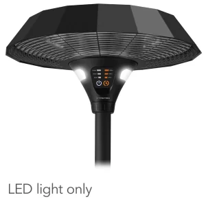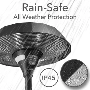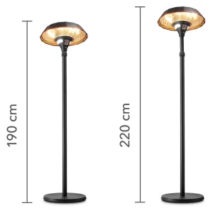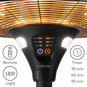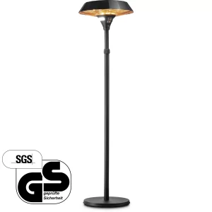 Máy sưởi bức xạ đặt sàn IRS 2110 công suất 2.100 watt kết hợp thiết kế sản phẩm nổi bật và chức năng tinh vi trong máy sưởi có hình dạng hình học của nó. Máy sưởi bức xạ màu đen mờ với thiết kế đa giác cung cấp cho ban công, sân thượng và khu vực ngồi và đứng trong dịch vụ ăn uống ngoài trời với nhiệt độ toàn diện ba giai đoạn (800 W, 1.300 W, 2.100 W) – mà không cần làm nóng trước lâu. Chỉ cần bật thông qua điều khiển từ xa hoặc bảng điều khiển cảm ứng và ngay lập tức cảm nhận được hơi ấm hồng ngoại dễ chịu trên làn da của bạn. Nếu cần, có thể lập trình bộ hẹn giờ tắt theo mức tăng 30, 60 hoặc 90 phút để tắt máy sưởi hoàn toàn tự động sau thời gian cài đặt trước. Chiều cao của máy sưởi đặt sàn có thể được điều chỉnh trong khoảng từ 190 đến 220 cm. Có thể thêm đèn bàn LED hai chùm khi cần để tạo ra bầu không khí ấm cúng. Điều này giúp tiết kiệm thêm đèn và chi phí năng lượng.