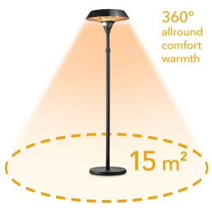 Nhiệt toàn diện 360° tỏa xuống bởi màn phản xạ 52 cm cũng làm nóng các khu vực lớn hơn theo cách có mục tiêu. Không giống như các máy sưởi đối lưu thông thường, IRS 2110 không làm nóng không khí xung quanh trước, điều này cực kỳ kém hiệu quả, đặc biệt là ở ngoài trời. Nhiệt hồng ngoại dễ chịu đặc biệt được hấp thụ và lưu trữ ngay lập tức bởi da. Nhờ nguyên lý hoạt động này, IRS 2110 làm nóng mạnh hơn đáng kể và tiết kiệm năng lượng hơn so với các công nghệ sưởi ấm khác – hơn nữa, không có mùi khó chịu hoặc tiếng ồn.